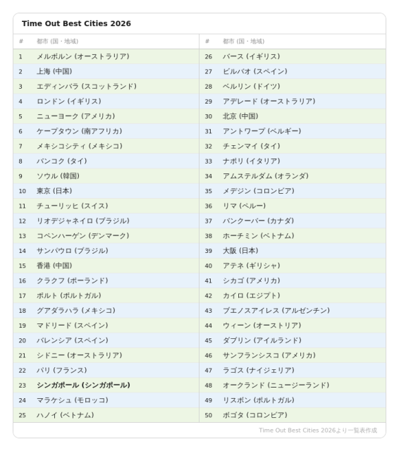 世界中の都市の「遊び・文化・ライフスタイル情報」を発信するメディア『Time Out』が発表した、「世界で最も優れた都市」ランキング (Time Out Best Cities 2026) 。